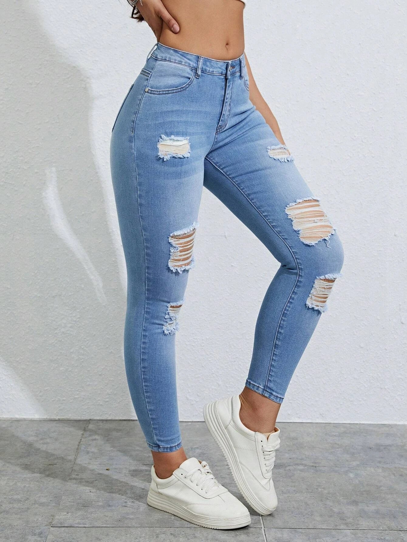 Fabric Elasticity: High Stretch Details: Button, Pocket, Ripped Pattern Type: Plain Style: Casual Closure Type: Zipper Fly Body: Unlined Color:...