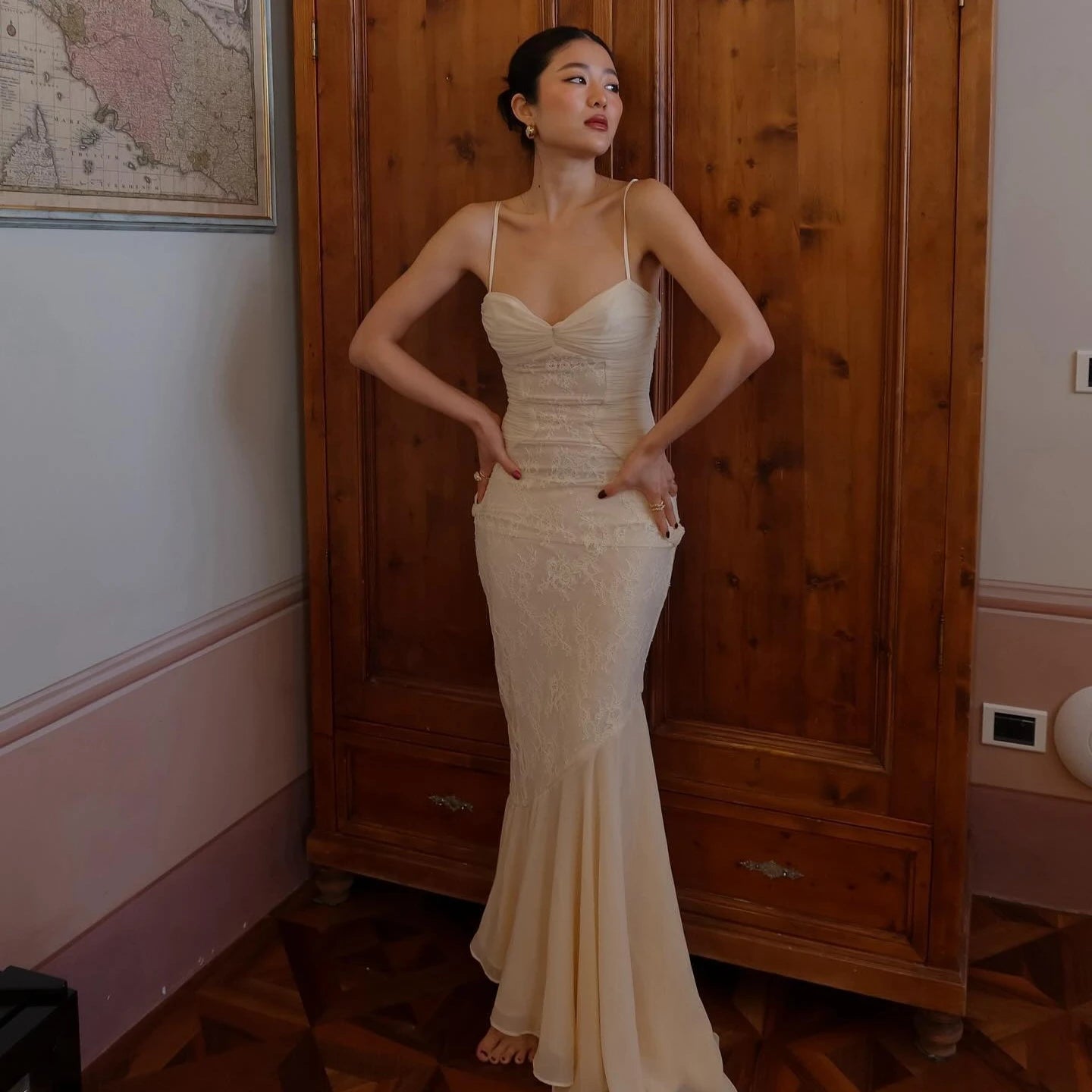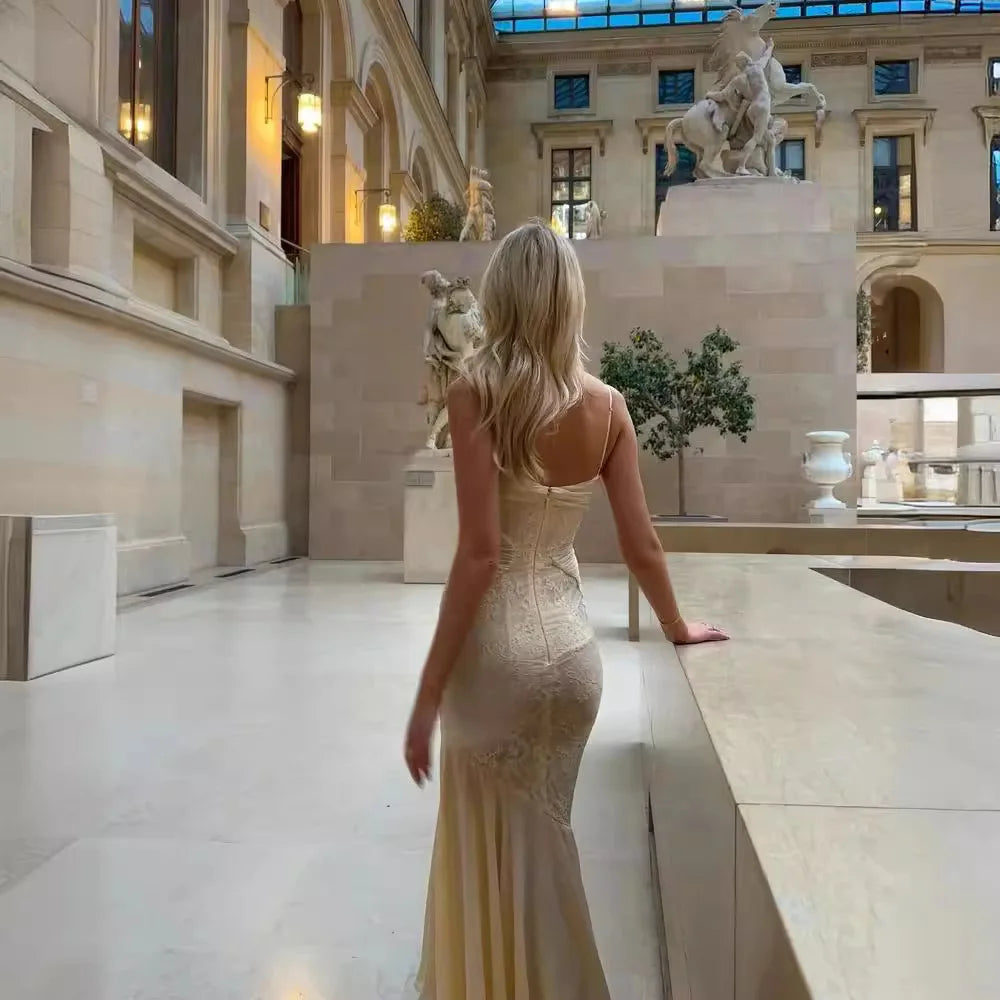 Mingmingxi Summer Long Dresses for Women 2024 New Arrivals Beige Elegant Lace Dress with Hem Spaghetti Strap Bodycon Party Dress
