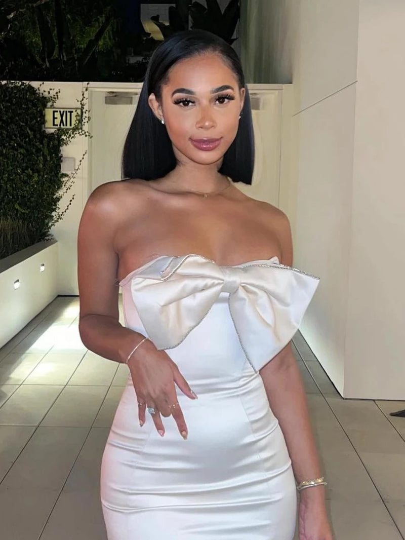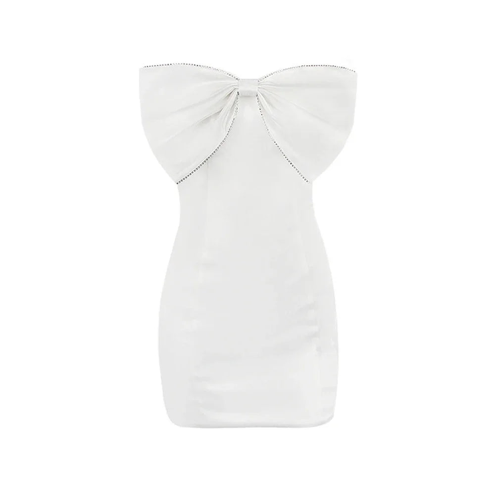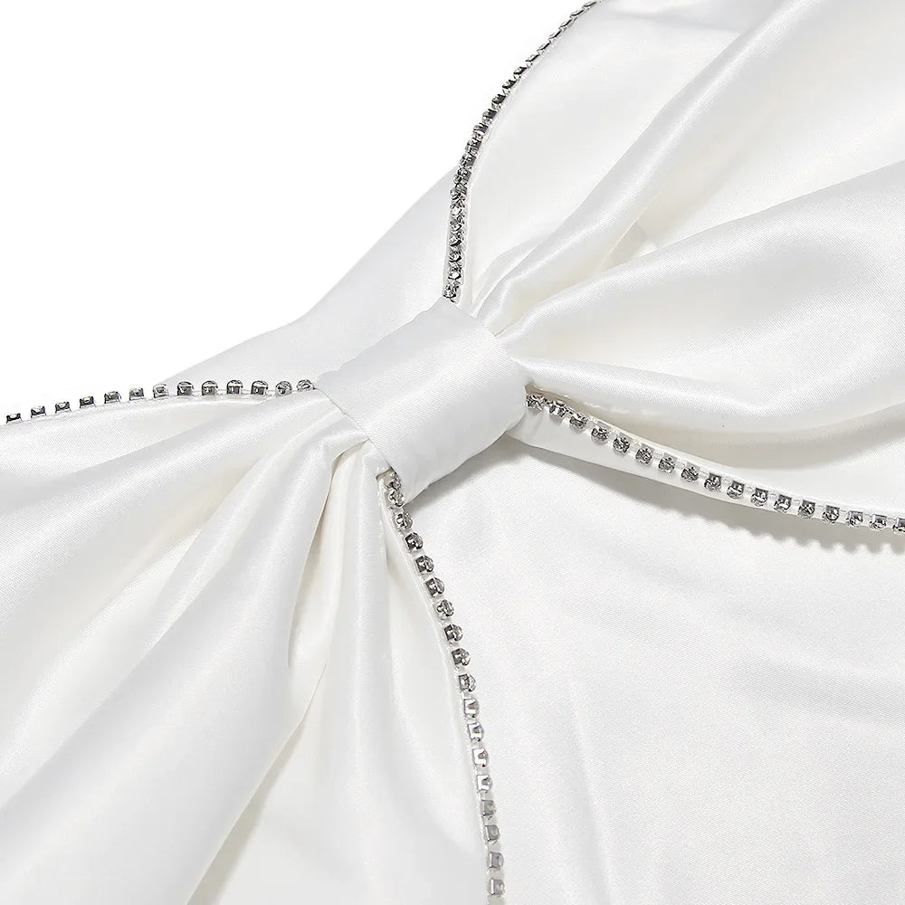 Sexy Satin Strapless White Bodycon Dress Mini Diamonds Bow Wedding Guest Night Party Dresses Summer Women Dress 2023