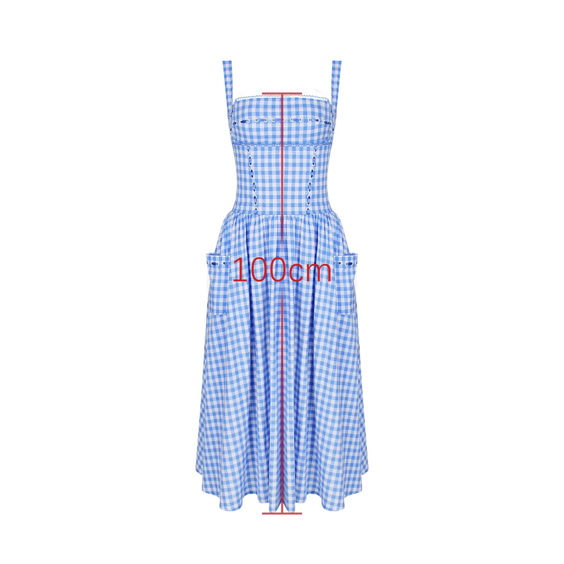 Summer Elegant and Beautiful Women Dresses 2024 Midi Blue and White Plaid Dress with Pocket Female Vacation Dress