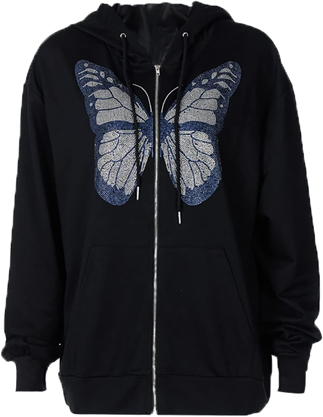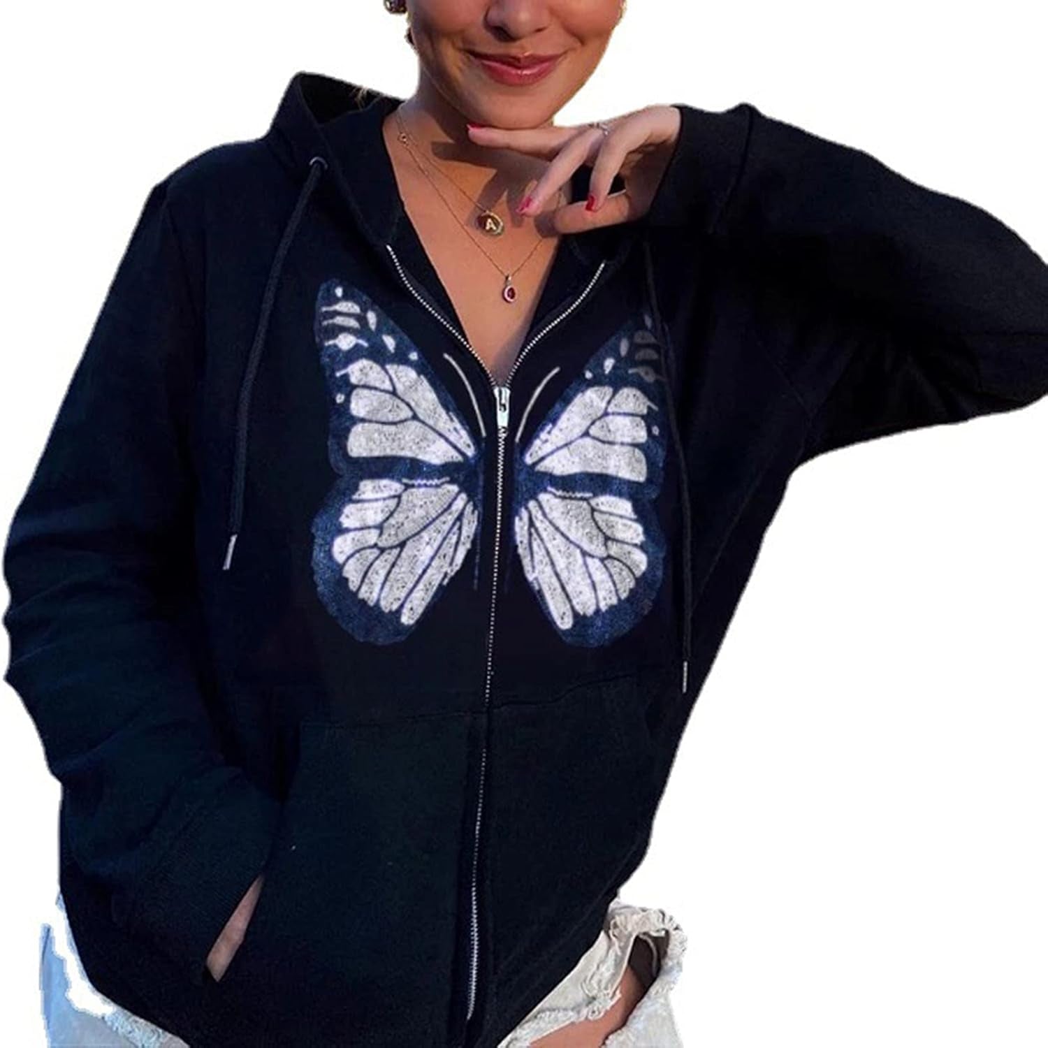 Women'S Gothic Hoodie Sweatshirt, Fashion Long Sleeve Loose Fit Comfy Pocket Butterfly Print Full Zip Hooded Coat Tops