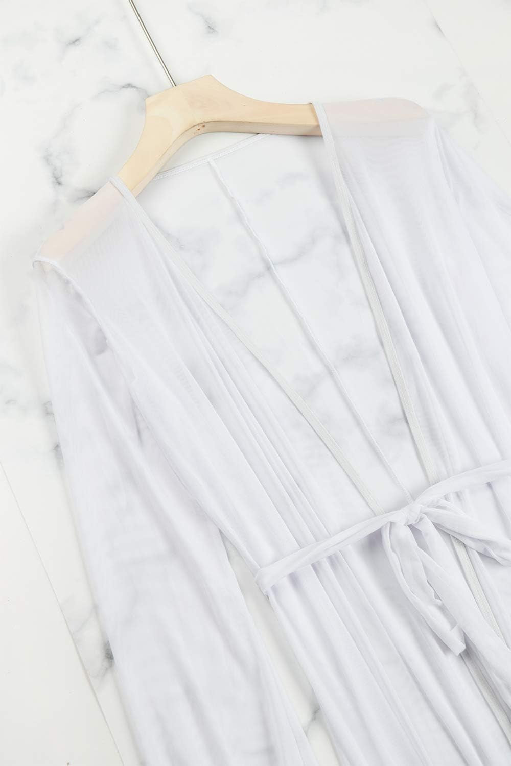 Women'S Sexy Thin Mesh Long Sleeve Tie Front Swimsuit Swim Beach Maxi Cover up Dress